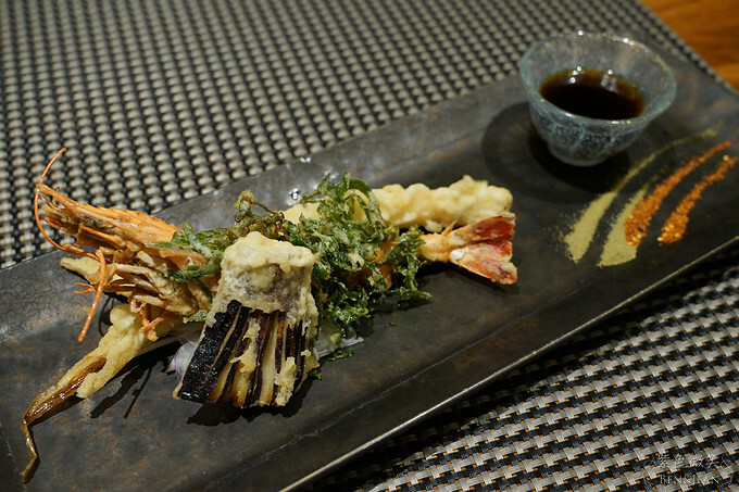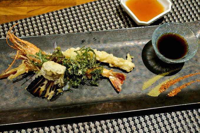 用菠菜葉包裹明蝦炸出酥脆的外衣,佐上主廚獨家天婦羅醬汁、七味粉及抹茶鹽做搭配,三種不同的搭配,增添豐富的層次感