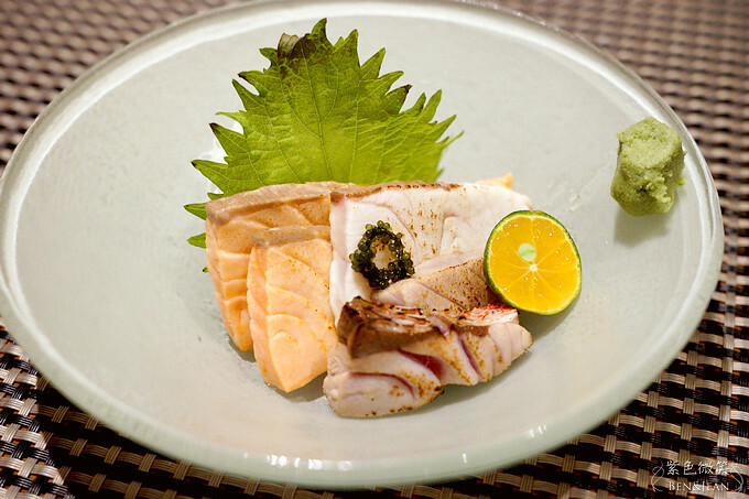 因為Jean不敢吃生魚片,主廚改用炙燒方式來處理鮭魚、海鱺魚、紅肉蒜,加點酸桔汁,味道一樣美味