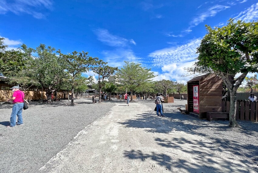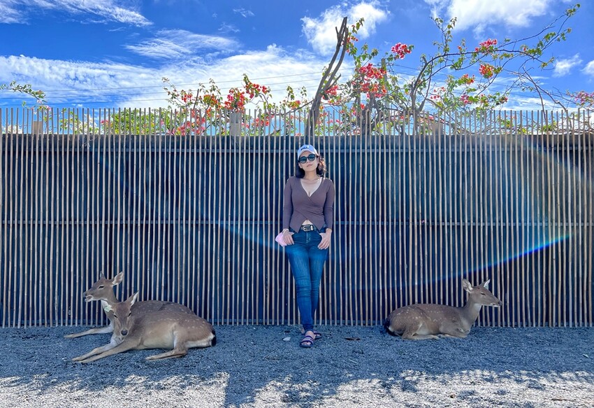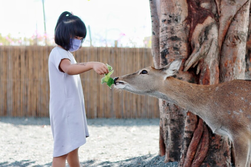 而進入梅花鹿的體驗區前,會由專人做簡單的解說梅花鹿的狀況以及相關注意事項等,每人可以憑門票、優惠券去換取一杯餵食梅花鹿的葉子,讓你可以先近距離體驗接觸梅花鹿,與梅花鹿接觸後想要買飼料餵牠們的話就也可以到櫃台購買飼料,在梅花鹿這個園區的體驗、遊玩、拍照是完全不限制時間!