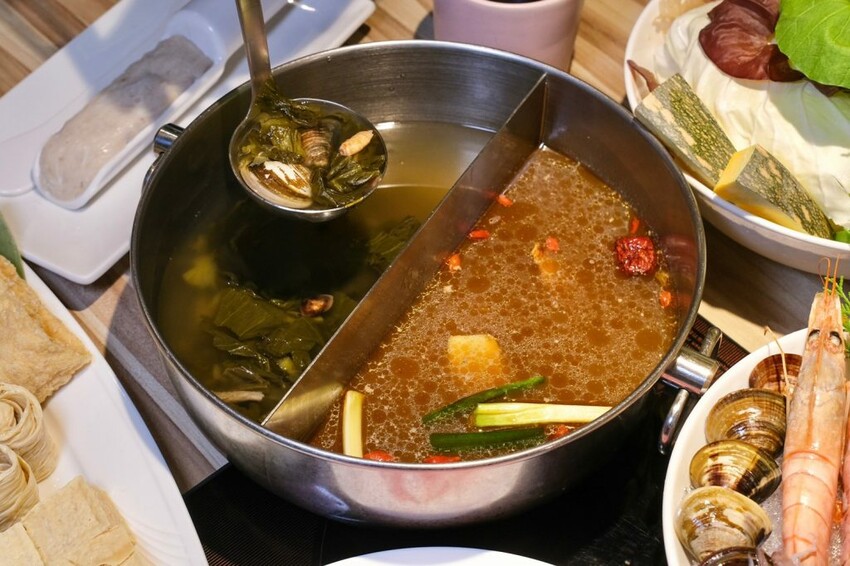 ▼湯頭共有七款不同的口味,招牌人氣湯底甘蔗羊骨湯,以羊骨 、黃耆 、老薑和新鮮蔬果熬煮,能喝到白甘蔗的清爽甜香,還有桂圓和紅棗的滋補香味,客家福菜蛤蠣鍋以醃漬福菜為基底, 不同於酸菜和鹹菜的重口味,入口滿是甘甜順口的香氣,帶出蛤蠣的自然鮮甜海味~
