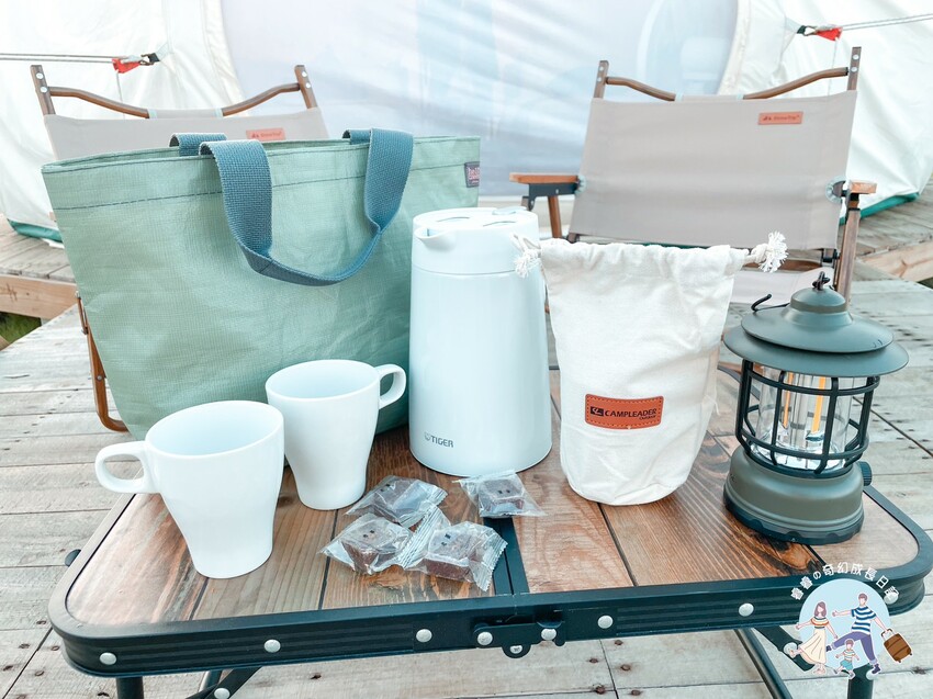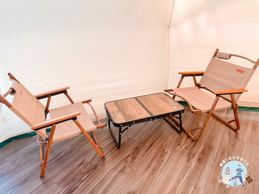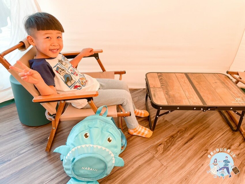 帳蓬內提供的露營桌、露營椅可以搬去帳蓬外使用,睿睿一看到就迫不及待地坐好,超會享受的他~