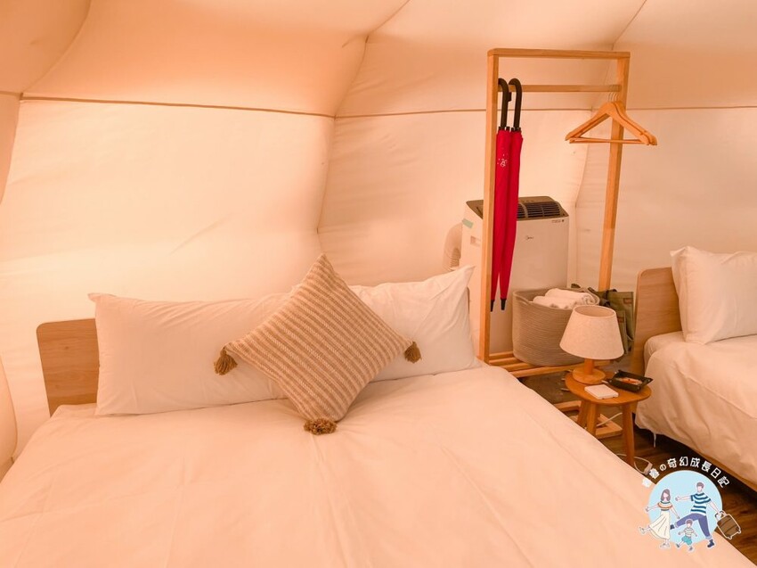 螃蟹區的帳篷屬於四人帳篷,裡面擺放了2張雙人床,大地色系的床組給人一種舒服感~