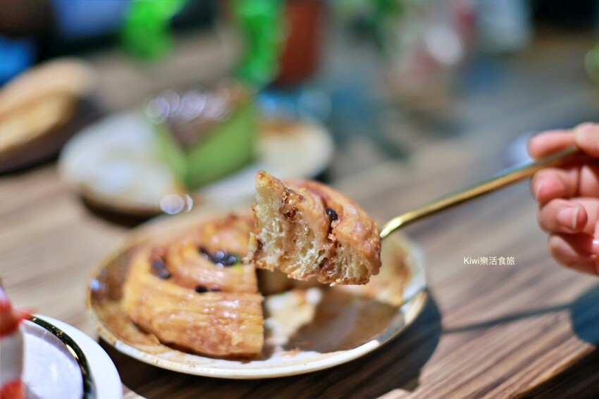 葡萄乾先用白酒浸泡,之後跟核桃一起包覆,經過四次的繁複手工後才能吃得到千層的酥鬆感,層層的香氣鎖在肉桂卷裡頭,好吃,也建議可以來杯茶品作搭配。