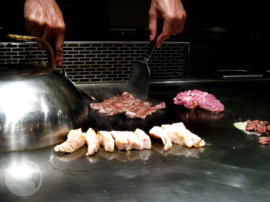 師父在料理好之後就將牛排放在瓷盤裡之後直接放在桌上,而我的豚五花就是直接和瓷盤一起在鐵板上熱著,