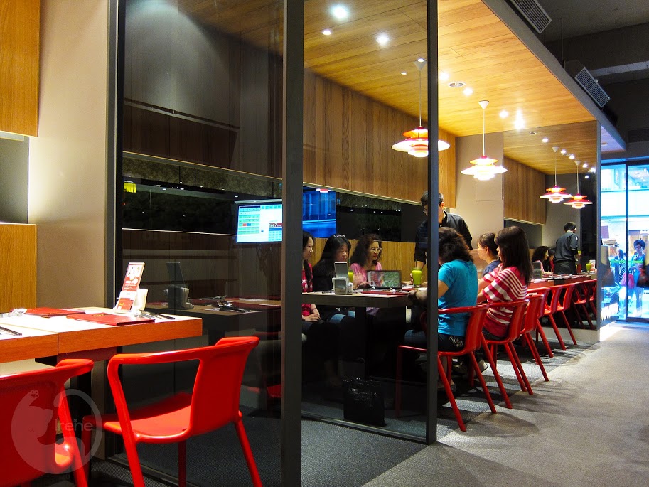 紅色的椅子是團體的座位區,可是就鐵板燒來說艾琳比較喜歡坐在綠色椅子的鐵板區,