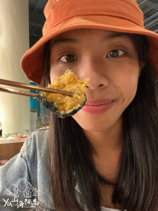 炸地瓜的外皮酥脆,裡頭又鬆又甜,裹上滿滿的海苔粉更香了。
