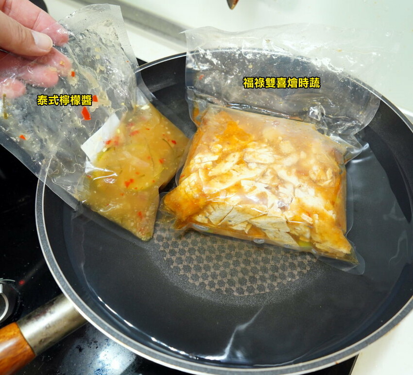 ▼泰式檸檬石斑魚附的泰式檸檬醬、福祿雙喜燴時蔬都可以一起隔水加熱,這些步驟其實都可以同步進行!