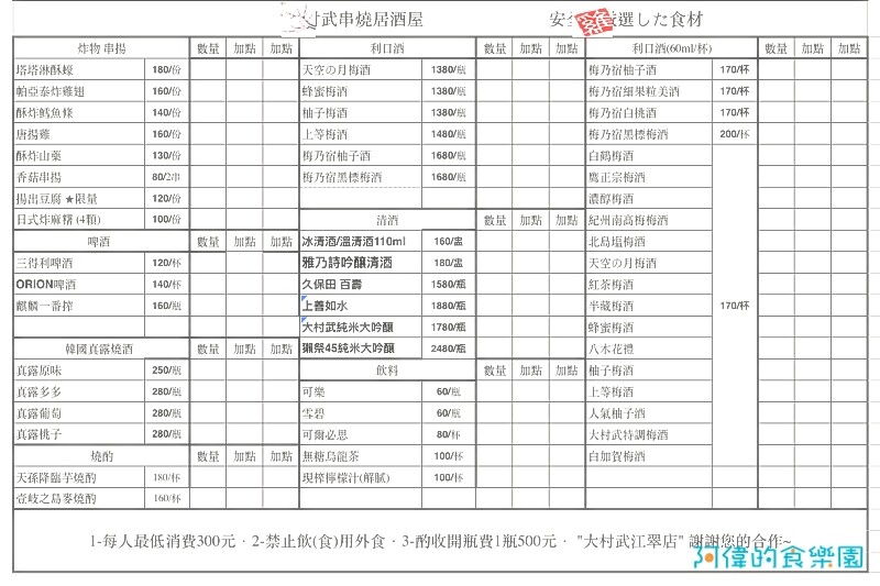 很開心「大村武」終於開到板橋,對於喜歡居酒屋、串燒、梅酒的新北市民來說是一大好消息。阿偉這晚跟五位朋友吃得超開心,大家都讚不絕口,期待下次再來吃吃其他的料理!(禁止酒駕、未成年勿飲酒、飲酒過量有害健康)