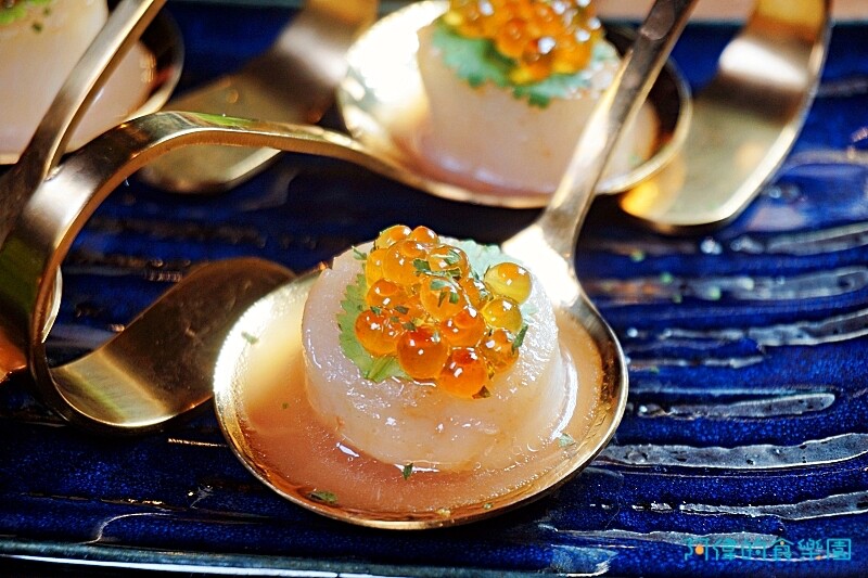 用金湯匙盛裝的香煎干貝鮭魚卵好貴氣,視覺上就很加分。
