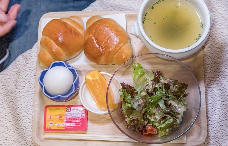 這是基本的早餐550日幣,據說疫情前只要490日幣。一碟小沙拉,兩個麵包、一碗湯。白煮蛋、水果。