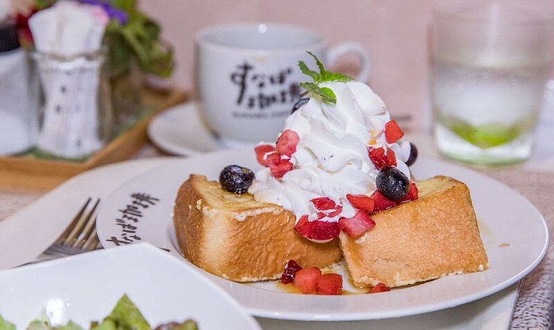 最後是四種早餐中最貴的厚法式土司850日幣,麵包很厚微Q,淋上糖醬後,上面擠滿鮮奶油和兩種莓果,是說這鮮奶油意外不會很膩口,還蠻好吃的,雖然吃多了也真有一點甜。
