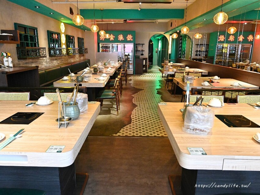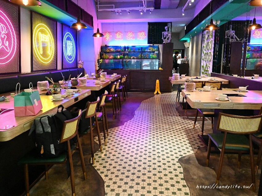蛤?! Huh Pot的座位區有三層樓,每一層的裝潢風格都不太一樣,一樓的座位區以4-6人為主,牆面上的霓虹燈造景,加上花磁磚地板,復古元素很有香港街頭繁華的氛圍