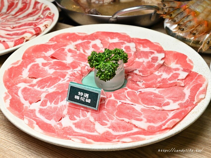 特選梅花豬肉取自豬前腿靠近背的部位,又稱肩胛肉,有著細緻的大理石紋油花,口感紮實多汁,吃起不會有豬腥味