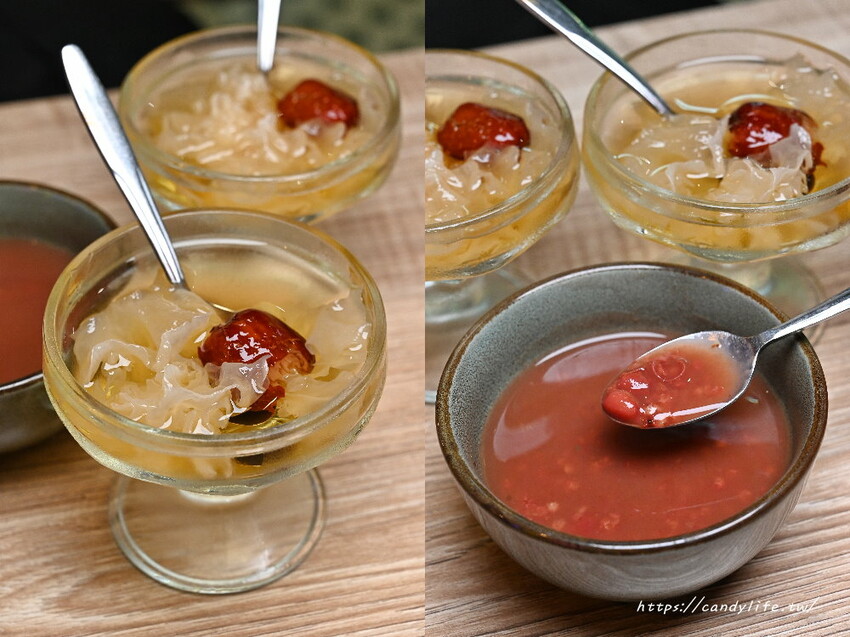 飯後甜點會不定期更換,糖糖今天的甜點有紅棗銀耳及紅豆湯,紅棗銀耳湯裡頭有滿滿銀耳,口感古溜,喝起來不會太甜,紅豆湯也好好喝,裡頭除了綿密的紅豆外,還添加了小米增添口感