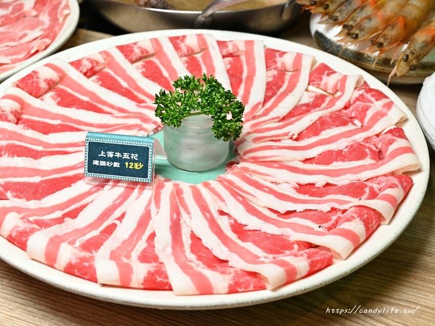 牛五花自胸腹左右兩側,有著豐富的油脂,搭配精肉,建議涮至12秒就可享用,肉質軟嫩多汁,牛肉香氣十足