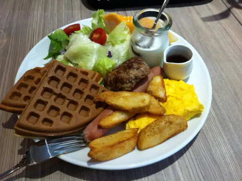 我們點了兩樣早午餐點,分別是「燻雞起司歐姆蕾蛋」(250元)及「法式吐司早午餐」(260元)。早午餐均附有主廚湯或果汁,飲品可選擇咖啡、紅茶、奶茶、水果醋等飲料。我們選了湯品,飲料則是熱咖啡及水果醋。由於看到客人多,所以心裡有預期送餐會恨慢,果不其然,大約了近半小時,這樣的管理效率實在應該改進。再者,我們覺得店裡的服務生臉都臭臭的沒笑容,感覺沒有服務熱忱,也是需要加強之一。