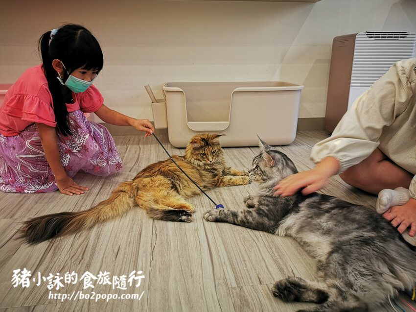 這邊有12隻貓咪,皆是緬因貓,貓咪們脾氣都很好,可以拿逗貓棒跟他們互動。
