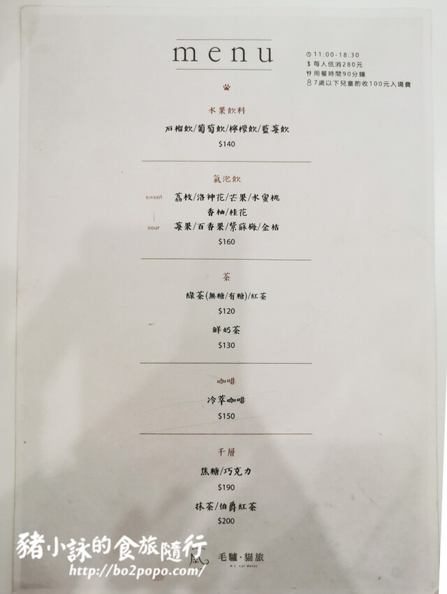 每人低消 280元,7歲以下兒童酌收100元入場費(當天毛毛因為有超過低消,所以這部分折抵),