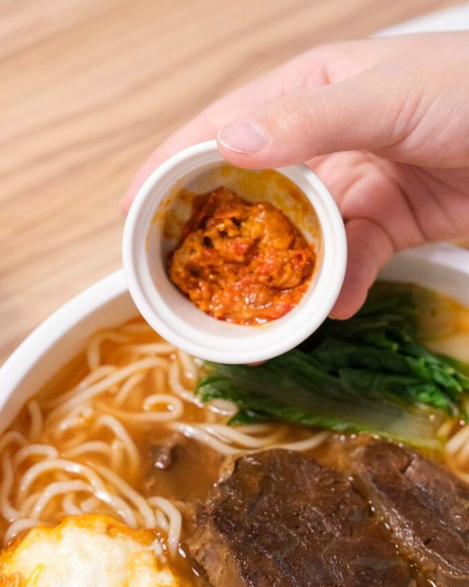 ▼優品御饌牛肉麵選用三款牛肉熬煮湯頭,加入美國、澳洲和台灣黃牛搭配番茄等食材,歷經數小時成就出清香的湯頭,單喝的話能感受到番茄及牛肉香氣,撒上蔥花及酸菜後增添豐富口感, 敢吃辣的人可以加特製辣椒醬 ,裏頭有鵝油和牛油讓湯頭風味更加分。