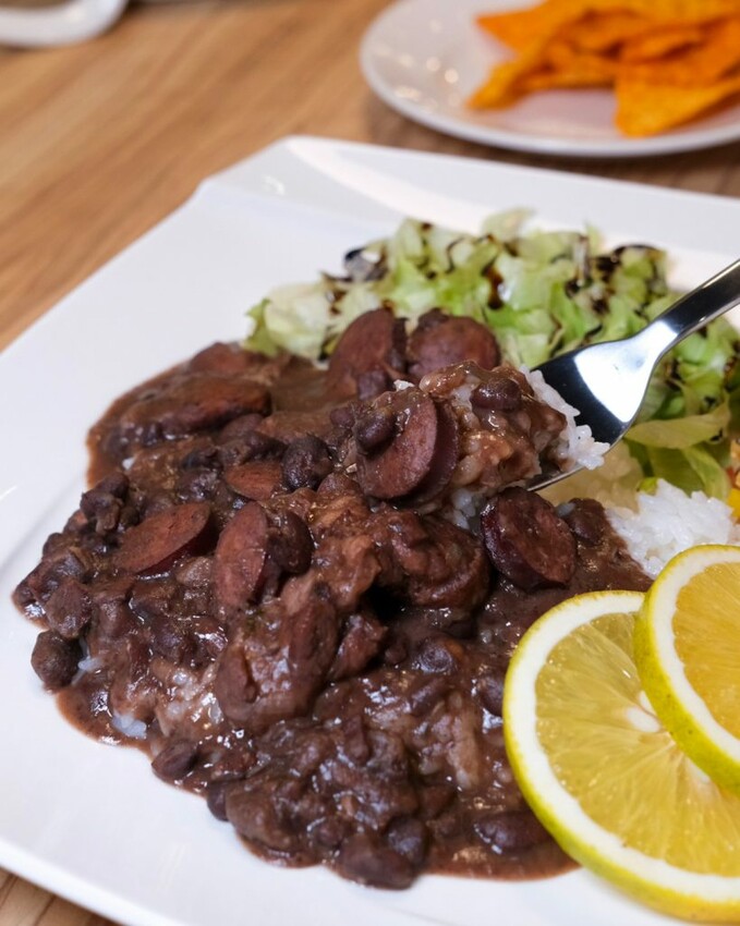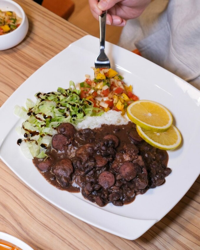 ▼經典的南美洲料理優品黑豆燉肉飯,濃稠黑豆泥中能吃到豬肉、培根和德國香腸,再搭配番茄莎莎醬及生菜增添清爽,最後以水果香吉士作為結尾,是當地人常見的道地吃法。