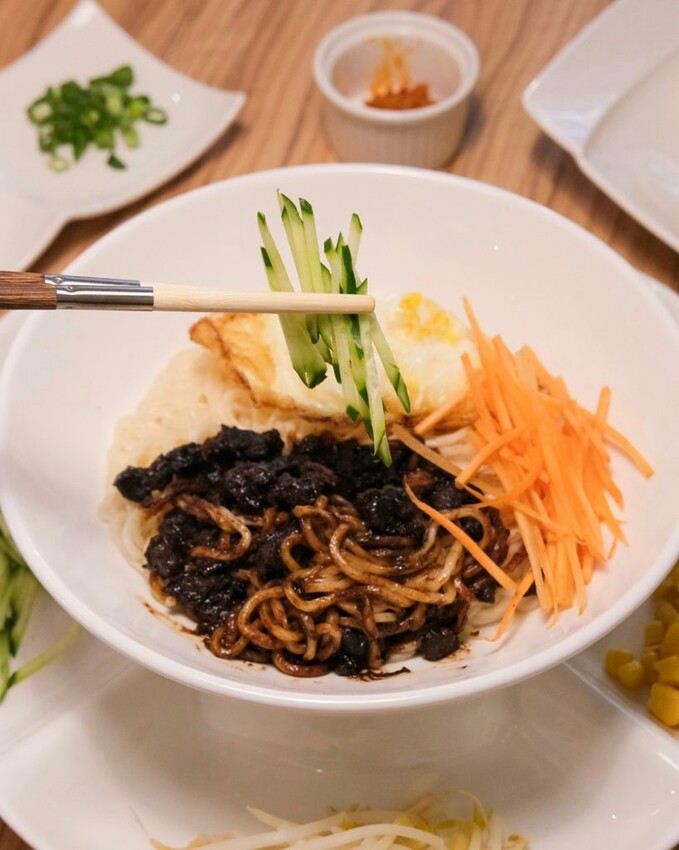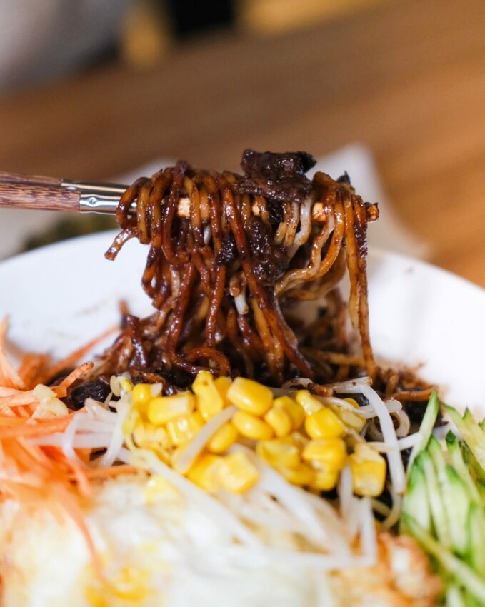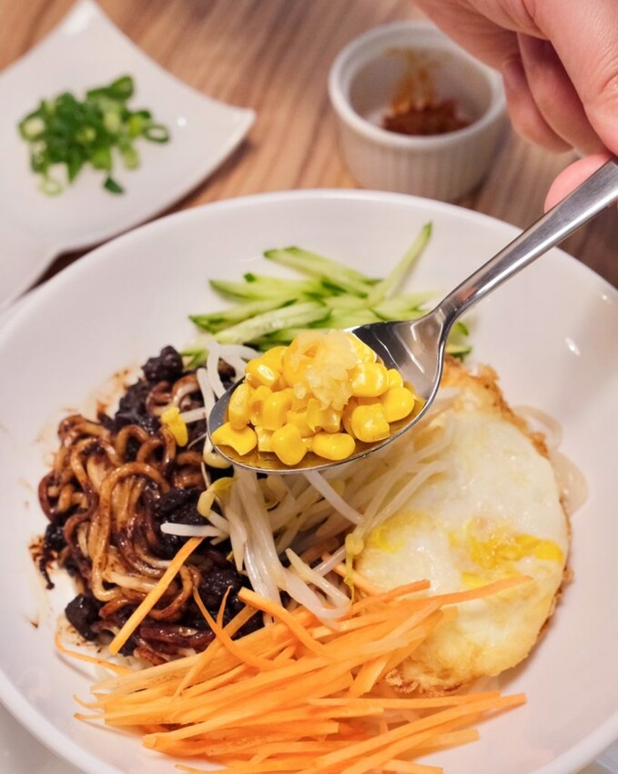 ▼擺盤精美的優品老北京炸醬麵,是北京的黝黑鹹香炸醬路線,搭配黃瓜絲、胡蘿蔔絲、豆芽、蒜泥和玉米,完美的沾附在彈牙的麵條上,涮嘴到會讓人停不下來!