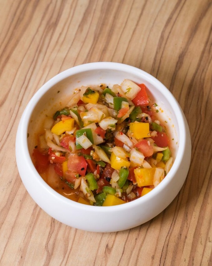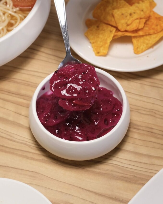 ▼小菜的品項都是店家獨門研發,火龍果藕片酸甜又開胃,百香果、柚子融合火龍果三種水果,堆疊出層層的酸甜香氣; 墨西哥玉米片莎莎醬有點微辣,玉米片搭著豐富配料很有口感。