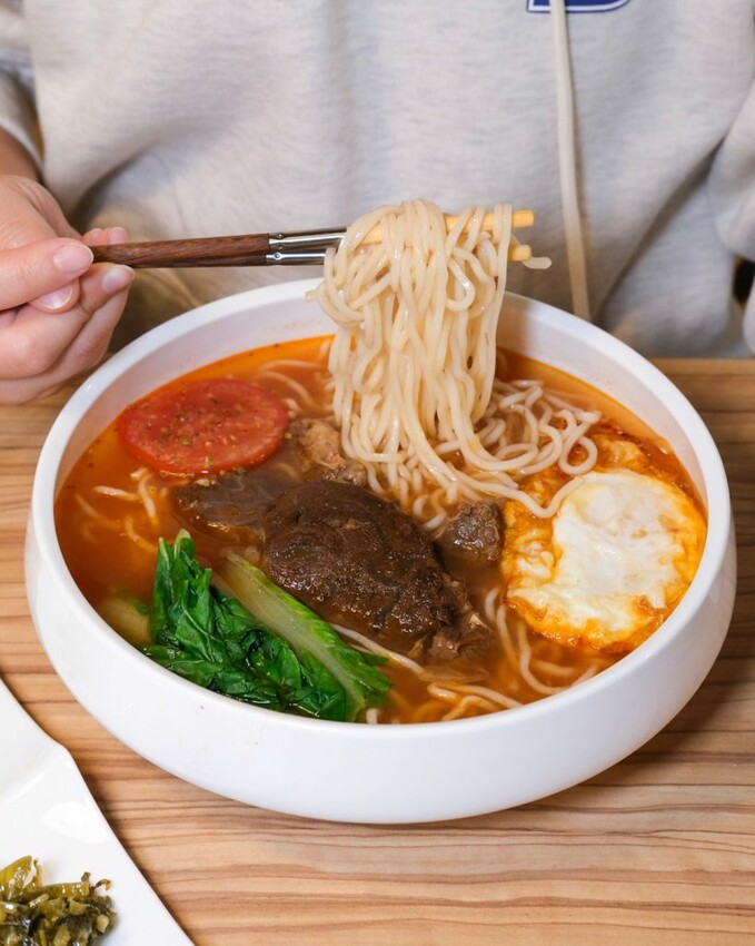 ▼整碗能吃到牛腱、牛筋和牛腩肉不同部位,燉到相當柔軟近乎入口即化,特別的是搭配一顆半熟荷包蛋,蛋液包裹著牛肉享用更加滑順。