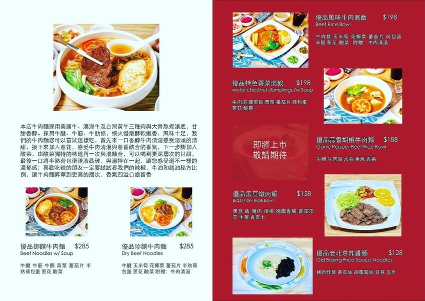 【黎記優品】以北京等國家風味簡餐為主打,其中最有人氣的就是招牌牛肉麵,還有炸醬麵、黑豆飯、牛肉蓋飯和湯餃等品項,價位從百元起跳不算太貴。