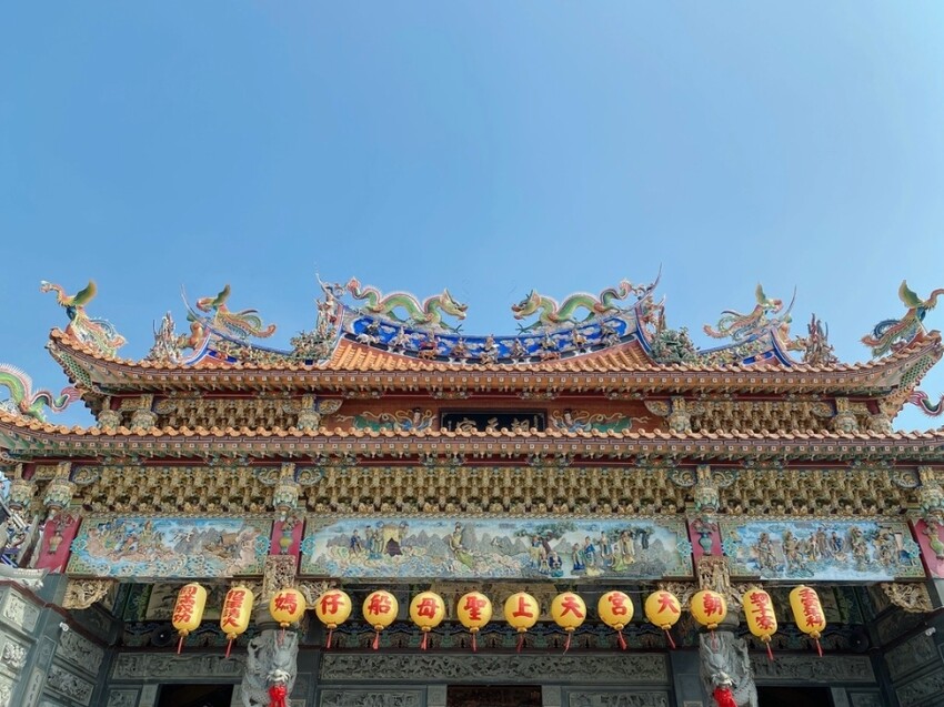 廟頂不同於一般的福、祿、壽雕塑,雙龍的交趾陶工藝,無論葷素信仰者,蚵仔寮朝天宮都很歡迎喔~