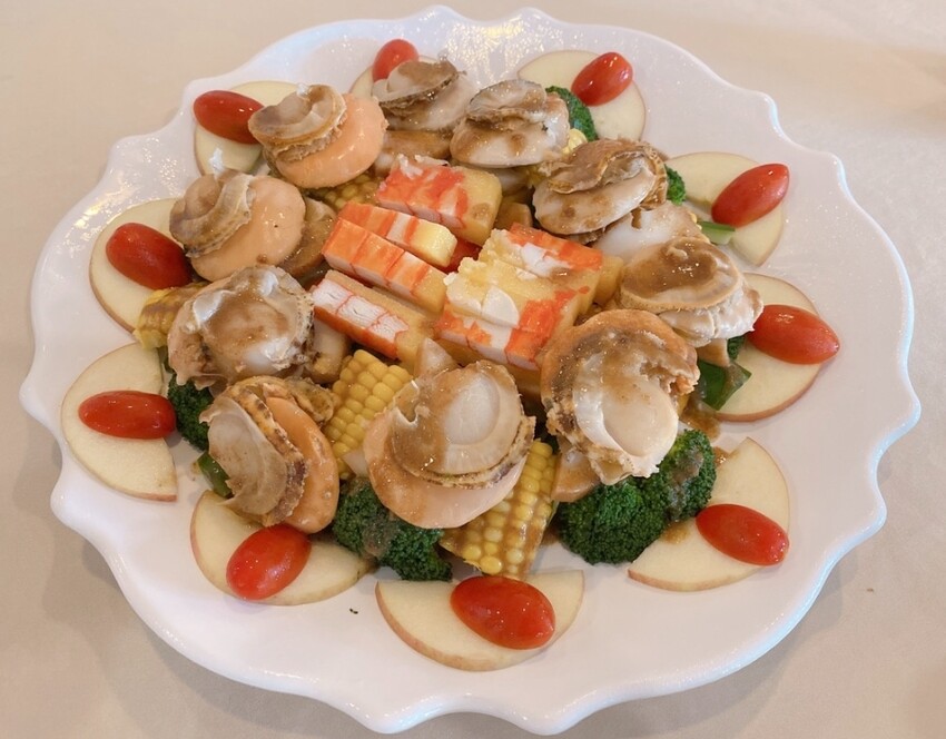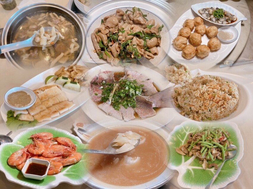 和風鮑魚帆立貝、櫻花蝦炒飯、海鮮炒鍋翅、白灼蝦、軟絲、水晶蚵花枝丸、清蒸海上鮮魚、三杯石斑肚、避風塘烏魚腱、藥膳養生蛤蜊子排燉魚膠、甜點、水果,豐富的鮮魚饗宴,吃一次保證就忘不了~