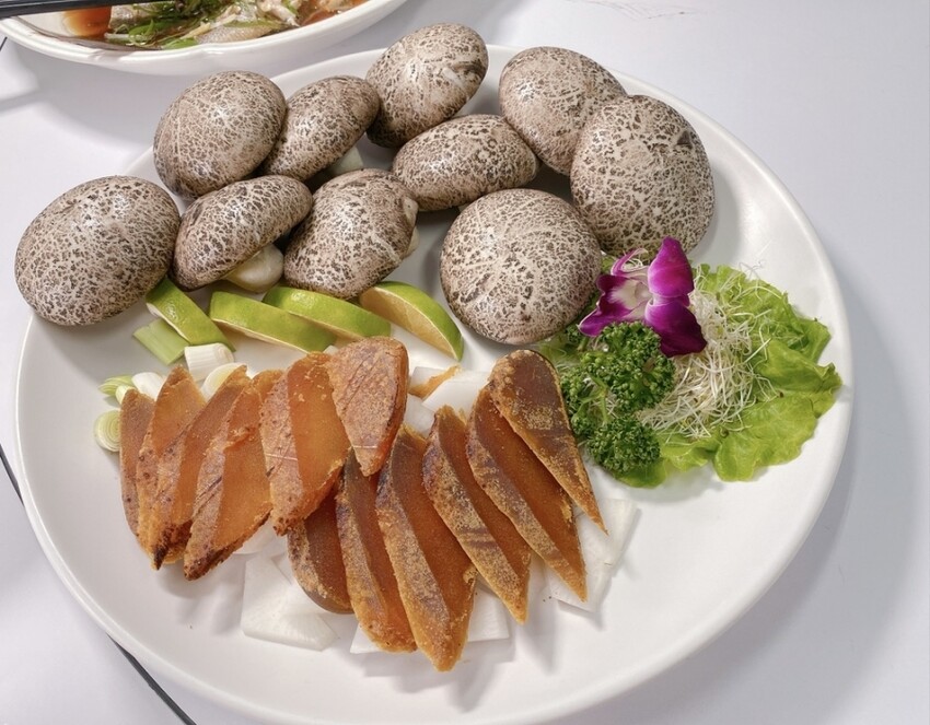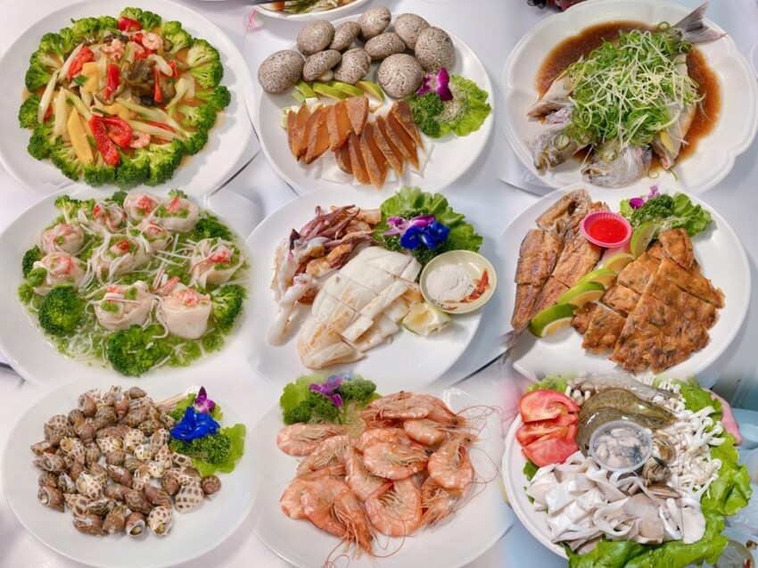 鮮蝦沙拉、 白鯧米粉湯 、生炒三鮮、蝦餅、烤ㄧ夜干拼盤、 軟絲香烤、 海鮮火鍋、風螺、如意白花、鮮魚清蒸、 烏魚子、和流沙包一下子全上桌~