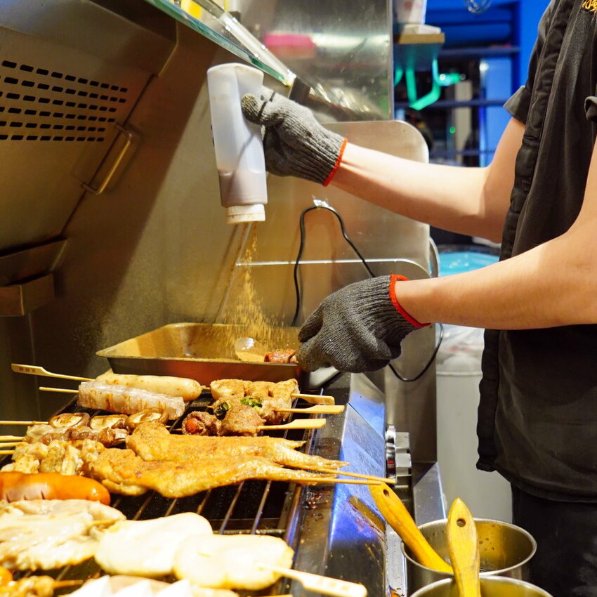 ▼特別的是這裡的串燒不事先油炸,都是現點現烤,光是這一點就叫人滿意~串燒烤物都會搭配招牌的漢方烤物粉及日式淡雅醬油做調味,吃起來也能襯出食材的鮮味特色,不會過於油膩,還算是滿特別的!只見服務人員灑粉完全沒在客氣,整個灑好灑滿,吃起來很夠味又不會搶味~