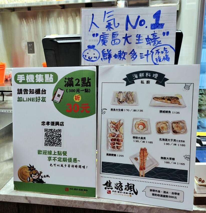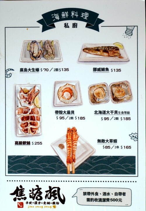 ▼這裡也可以當作私廚的概念,想要吃好一點的海鮮料理也沒問題,有廣島大生蠔、高級軟絲、挪威鯖魚、帶殼大扇貝、北海道大干貝、無敵大草蝦等,價格也不會太高,吃起來滿足又不傷荷包!