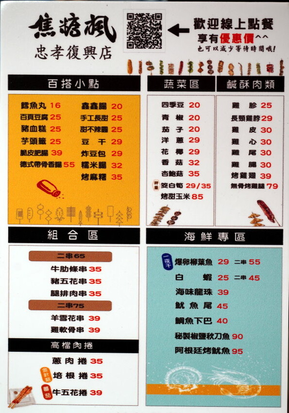 ▼焦糖楓菜單,有蔬菜類、鹽酥肉類、百搭小點、組合區、海鮮專區等,最低16元起就能享用到美味的串燒;因為這裡都是現點現烤,所以需要稍微等候一下~所以也有提供LINE線上點餐,先點餐後自取就可以省去不少等待時間,貼心又方便!