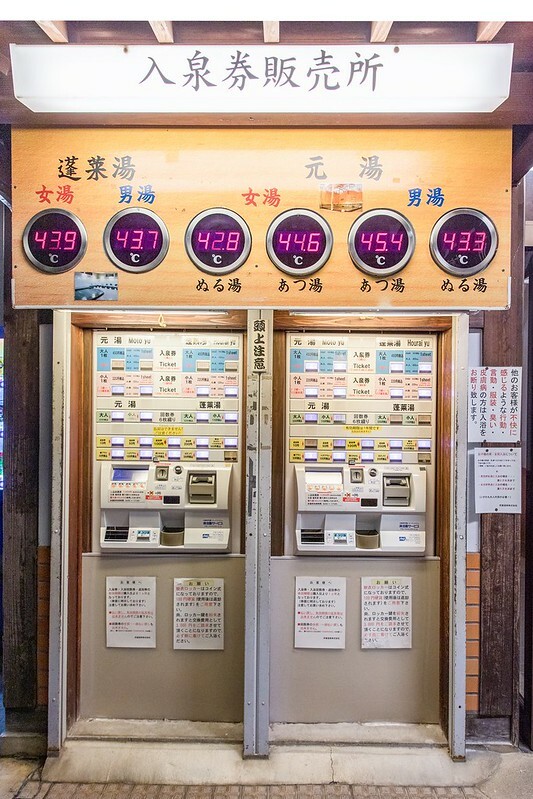 一般觀光客多數以體驗公共溫泉「蓬萊湯」、「元湯」為主,門口的售票機可以買到入場卷,售標機上還有顯示溫泉的溫度。