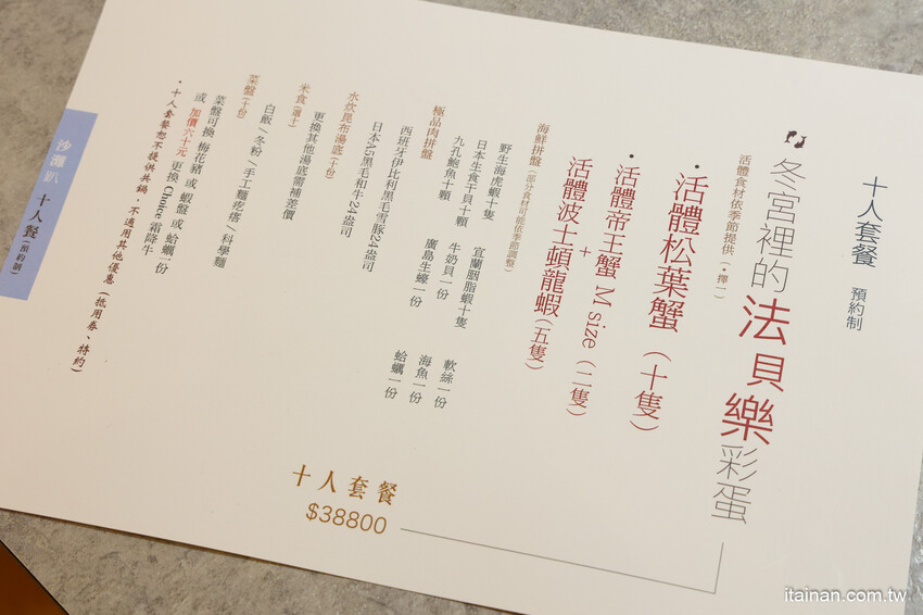 年末將近,不管是尾牙、春酒或是家庭聚會、除夕團圓,想要感受前所未有的超奢侈享受,一定要吃起來,『沙灘海鮮趴-冬宮裡的法貝樂彩蛋』十人套餐,採預約制,要吃可得既得提前預約喔。