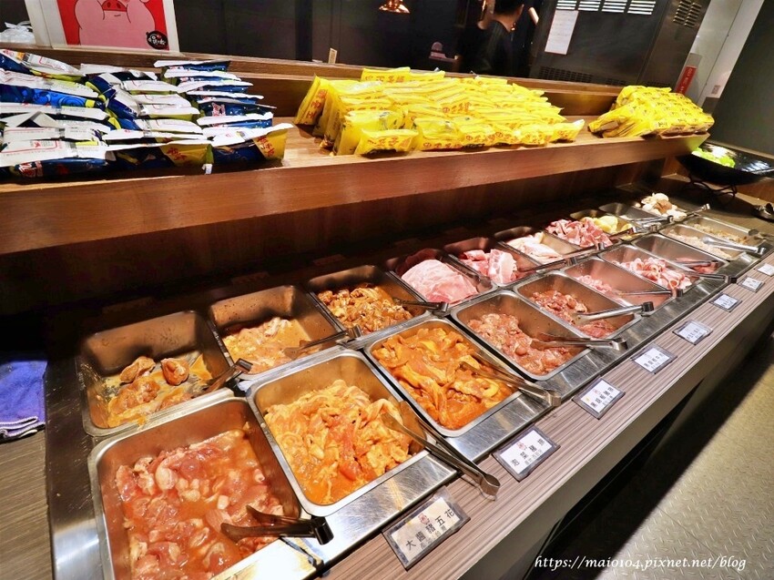 光肉類就有大醬豬五花、泡菜豬排、香油豬排、黑胡椒豬排、黑胡椒牛肉、香草雞腿排、蒜香雞翅、照燒雞丁、原味牛五花、原味梅花豬、帶皮豬五花、帶骨豬小排、羊五花、原味羊小排