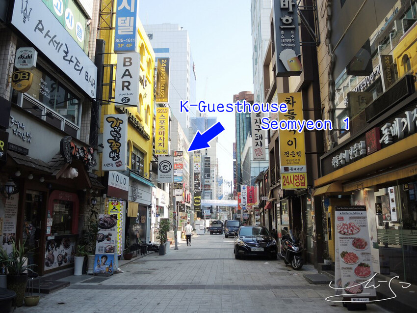 西面K-Guesthouse離地鐵走路約5~10分鐘可以到,地理位置應該算在西面和田浦站中間