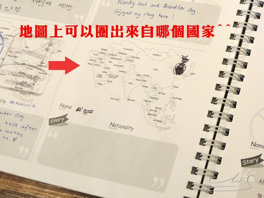 桌上有擺放留言本本 分別是美洲/亞洲/歐洲非洲澳洲