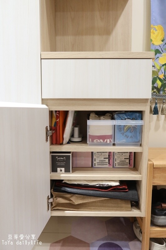 這邊的最上層我們放了飲料提袋、小提袋、購物袋等小物,出門有需要的話可以馬上拿出來放包包,