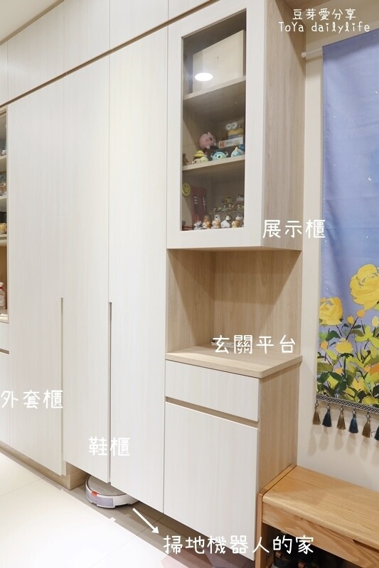 整排系統櫃在玄關的部分是由展示櫃+玄關平台、鞋櫃、外套櫃所組成。