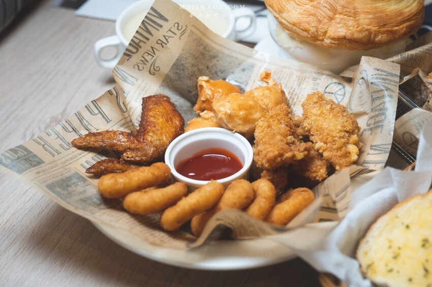 喜歡吃炸物的朋友他們家的炸物拼盤可以點,裡面有炸雞翅、洋蔥圈、花枝丸跟酥炸魚柳條。搭配飲料吧的汽水更對味。
