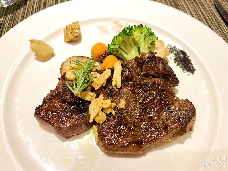 外皮烤的帶點焦香,七分熟的沙朗咀嚼中滿JUICY 的,愈嚼愈香!!
