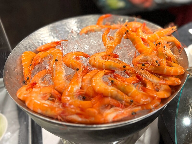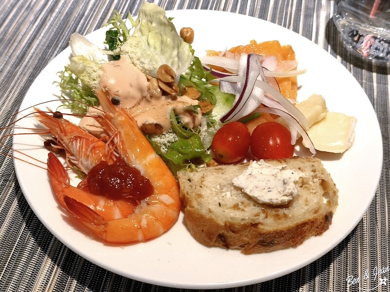 沙拉吧的選擇也算不錯啦。鮮蝦、燻鮭魚、起司,火果、甜點~~也滿豐富的