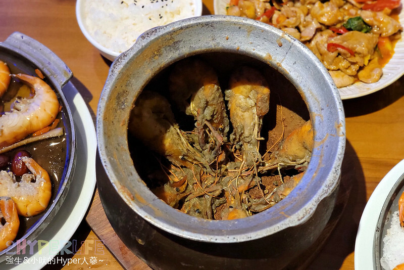 用一整個甕出場上桌,香氣還蠻足夠,只是一整鍋看起來有點灰灰土土的?原本以為是有刷什麼料,詢問後只有單純使用鹽、胡椒跟米酒一起煮熟後,最後才有濕濕黏黏的醬沾附在蝦子上面哦!