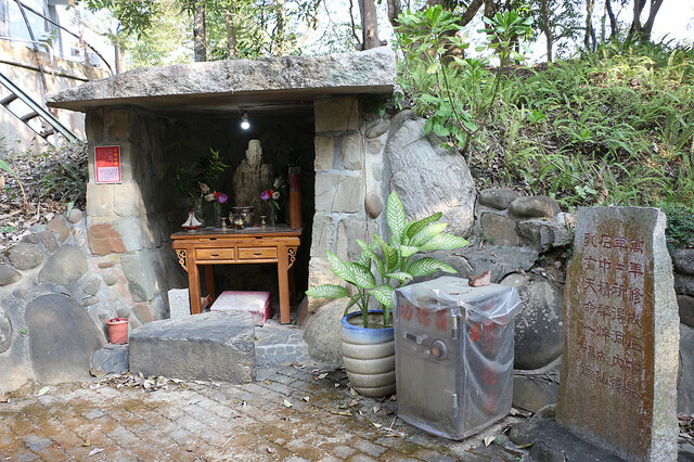 小普陀禪修公園,入口一座鐘乳石土地公石像,石碑上寫為「石中晶」,導覽老師表示,網路上都因石像外觀形似觀世音菩薩,都稱石像為觀世音石像。其實當初有通靈體質的創園師傅圓靚比丘尼,看到的是土地公,因此安奉於公園入口護佑眾生大德。