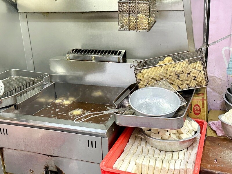 中港路蚵仔麵線的臭豆腐是切成小塊狀預炸好,等客人點餐再下油鍋熱一下