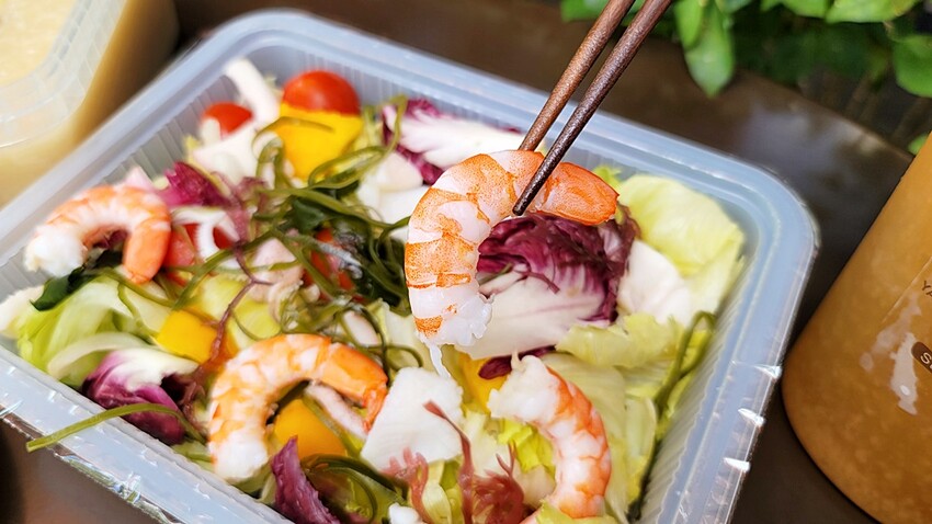 白蝦新鮮又彈牙鮮甜搭上鮮脆的生菜口感超棒,小涼個人喜歡單吃享受食材的原始味道,但如果你偏愛加醬汁吃沙拉,亦可加入鴨棧所附的和風油醋醬吃,味道也很清爽唷~