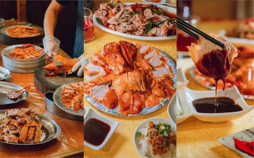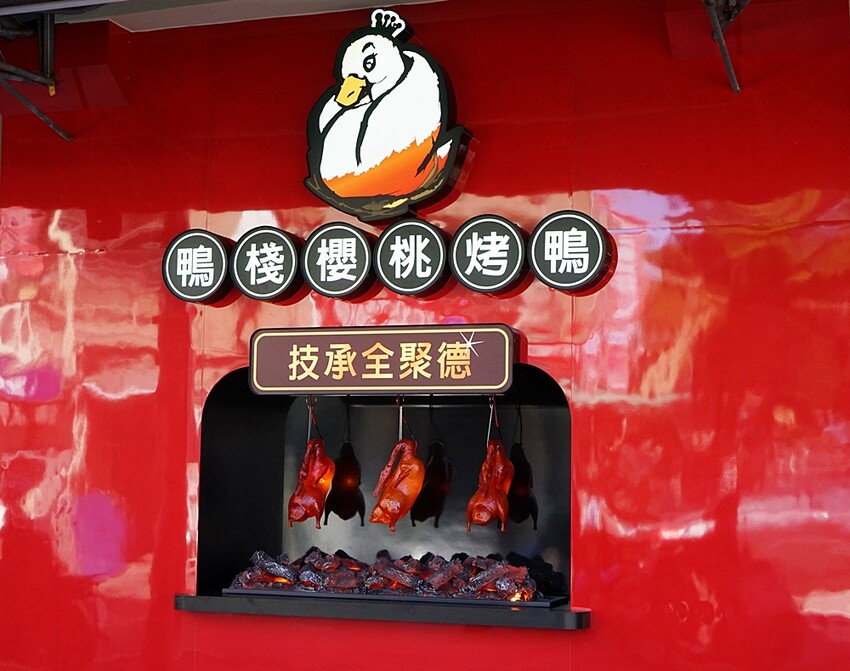 門口處還貼心地設上一個烤鴨打卡牆,三隻烤鴨在炭火上面烘烤的景,冒煙在夜晚時分更引人注目呢