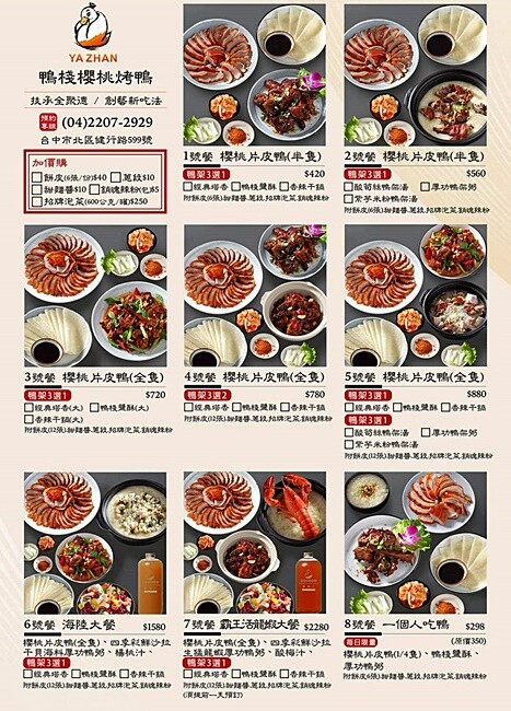 鴨棧櫻桃烤鴨菜單,店家特別規劃了1~8號餐供顧客選擇,依照自己喜歡的搭配來選購,櫻桃片皮鴨半隻、一隻都沒問題,鴨架有經典塔香、鴨棧鹽酥、香辣干鍋可選,另也有功夫鴨架湯品酸筍鴨架湯、厚功鴨架粥、紫芋米粉鴨架湯,想給家人吃得更澎湃更豐盛亦可選6號海陸大餐(多了四季彩鮮沙拉、干貝海料厚功鴨架粥、楊桃汁)或7號需提前一天預訂(多了四季彩鮮沙拉、生猛龍蝦厚功鴨架粥、酸梅汁)。就算是單身狗也能開心吃烤鴨(8號)是你最佳選擇~